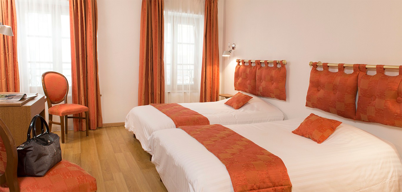 Ca. 12 m² großes Zimmer mit zwei getrennten Betten. Das schallgedämmte und elegante Zimmer mit Parkett und einer Einrichtung in warmen Farben lädt zu einem angenehmen Aufenthalt im Herzen von Sedan ein.